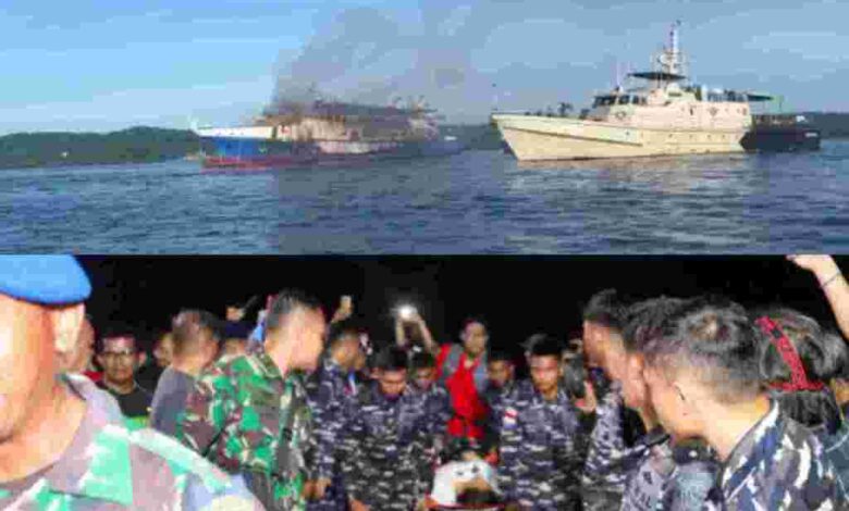 Lantamal VIII Manado Bergerak Cepat Evakuasi Penumpang KM Barcelona V yang Terbakar di Perairan Pulau Talise